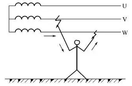 兩相觸電是指人體同時(shí)接觸設(shè)備或線路中的兩相導(dǎo)體而發(fā)生的觸電現(xiàn)象。若人體觸及一相火線、一相零線,人體承受的電壓為220V;若人體觸及兩根火線,則人體承受的電壓為線電壓380V。兩相觸電對(duì)人體的危害更大。