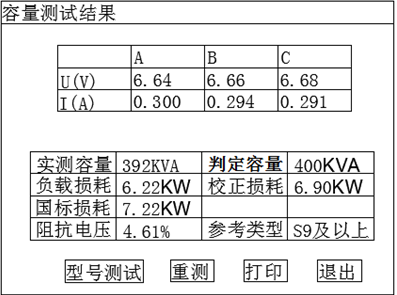 實(shí)測(cè)容量:該項(xiàng)顯示實(shí)際測(cè)量的變壓器的容量。