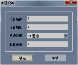 在“設備管理”區域內點擊鼠標右鍵,選中“添加設備”彈出如下圖2-3新建設備對話框,設備名稱可自命名,設備地址為下位機地址(可在下位機系統設置界面中查詢),根據需要選擇相應的通道數目和起始通道(默認起始通道為1)。當通道數目大于64或者需要將通道分成不同的類,可以各類通道掛在不同的設備上。如前8個通道測量溫度,后8個通道測量濕度并且想把他們以不同的窗口顯示出來,可以按一下操作進行:1)建立一個新的8個通道的設備,設備名稱->設備地址為1 ->通道數量8通道->起始通道1;2)再建立一個8通道的設備,設備名稱->設備地址為1 ->通道數量8通道->起始通道9。以上是對于同一臺儀器不同通道的操作。
