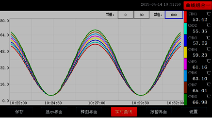當前曲線記錄只保留單屏的顯示數(shù)據(jù),可根據(jù)觀察的需要,通過改變Y軸和時標X軸來改變顯示刷新的速度,各條曲線一致,并不影響FLASH記錄的時間間隔。