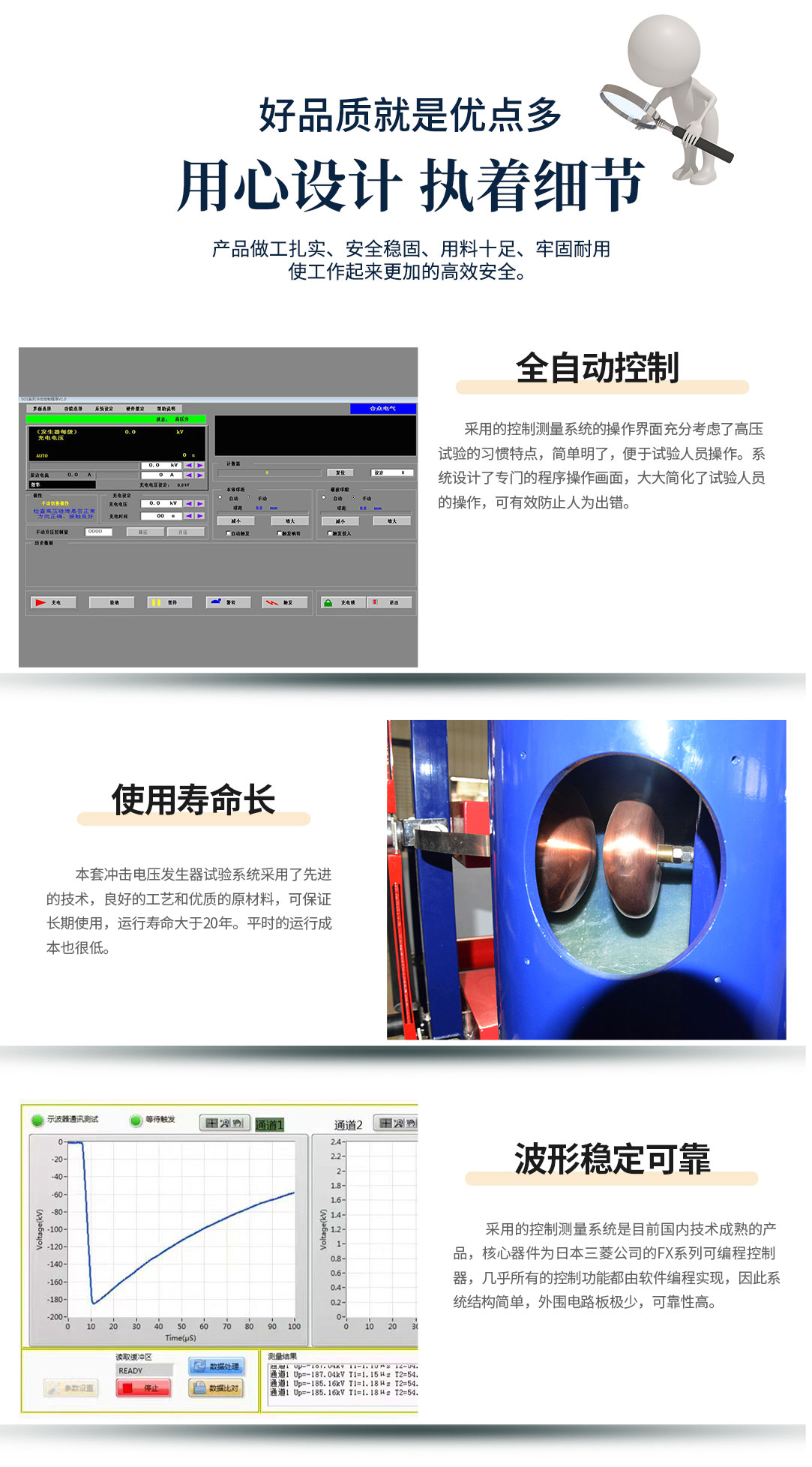 波頭時間:1.2±30%μs,波尾時間:50±20%μs,過沖:小于5%,效率:不低于90%。±1.2/50μs標準雷電沖擊電壓全波,效率大于90%。