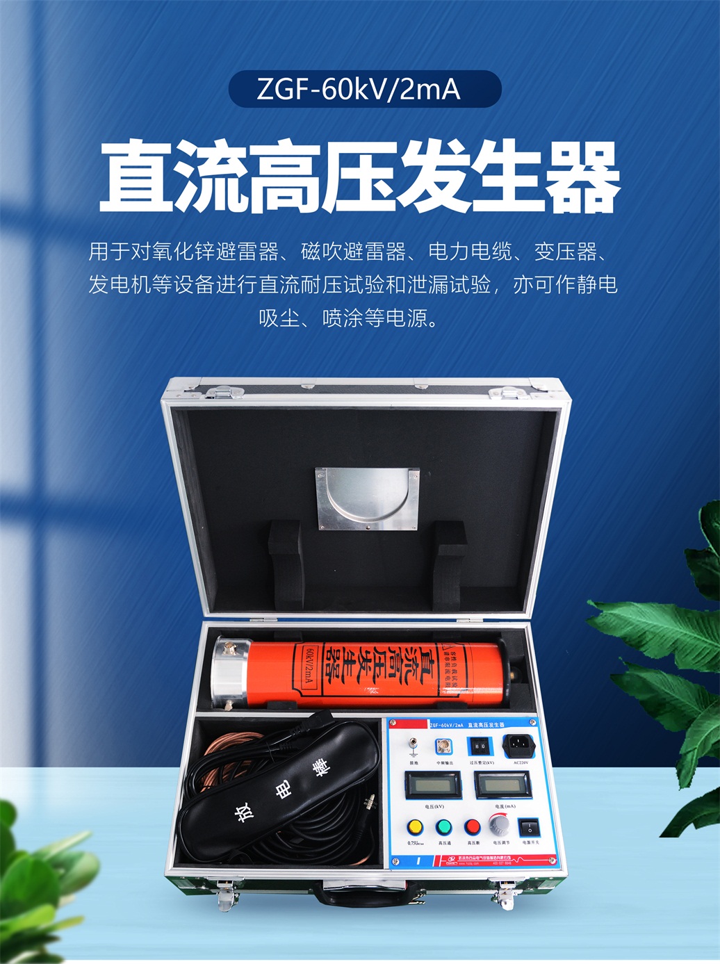本儀器適用于電力、鐵路、化工、工礦、冶金、鋼鐵等部門對氧化鋅避雷器、磁吹避雷器、電力電纜、變壓器、發電機等設備進行直流耐壓試驗和泄漏試驗,亦可作靜電吸塵、噴涂等電源。