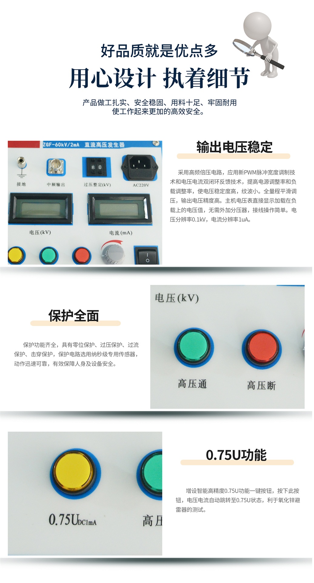 2、保護全面:保護功能齊全,具有零位保護、過壓保護、過流保護、擊穿保護,保護電路選用納秒級專用傳感器,動作迅速可靠,有效保障人身及設備安全。