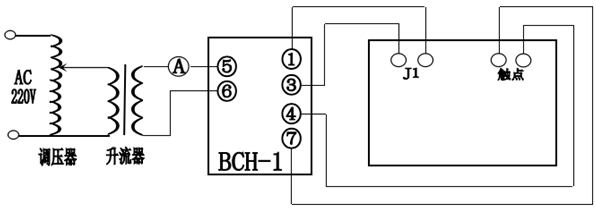 按上圖接線,斷開(4)(6)端子的連接片,動作回路取39匝,制動回路取14匝,調壓器(較大容量5KVA以上)和本儀器使用同-220V電源時,升至電流到要求的安匝,按交流繼電器的方法做出動作電流。如果動作安匝安全不對,可能是制動電流和動作電流的相角是180度,把制動電流反相就好了,如果本儀器使用三相電中的一相,調壓器使用另外一相,通過改變相別的將升流器正接反接可得到60°的相角。如外接移相器,亦可得到全部的0°、30°、60°、90°的相角。